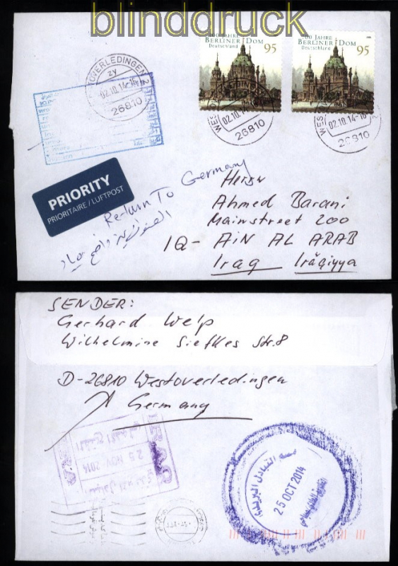 Bundesrepublik Zurück Westoverledingen 2014 in den Irak diverse arabische Vermerke Luftpost-Brief aus Westoverledingen 2.10.2014 nach Ain Al Arab in den Irak vorderseitig und rückseitig mit diversen handschriftlichen arabischen Vermerken handschrift Return To Germany vorder- und rückseitig mehrere irakische Stempelabschläge Erhaltung siehe Scan