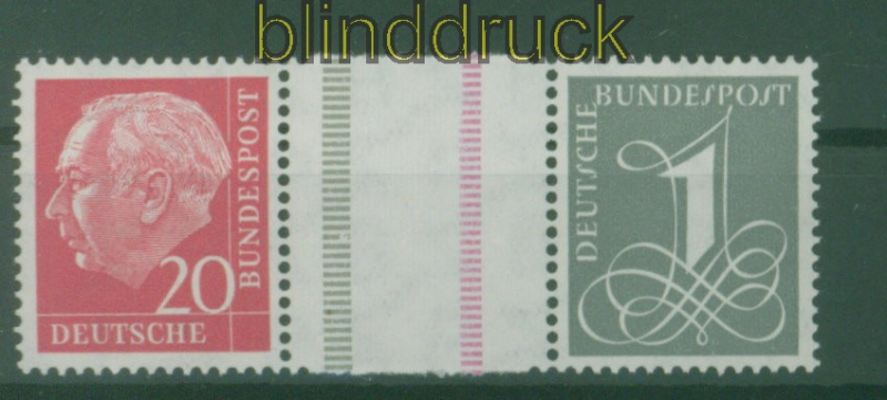 Bundesrepublik Zusammendruck Mi # WZ 16 a I X postfrisch Heuss 20 + Z + 1 Pfg. Heuss stehendes Wasserzeichen waagerechter Zusammendruck mit Zwischensteg Zwischensteg mit einer grauen Strichelleiste und einer halben Strichelleiste in rosalila postfrisch einwandfreie Erhaltung siehe Scan
