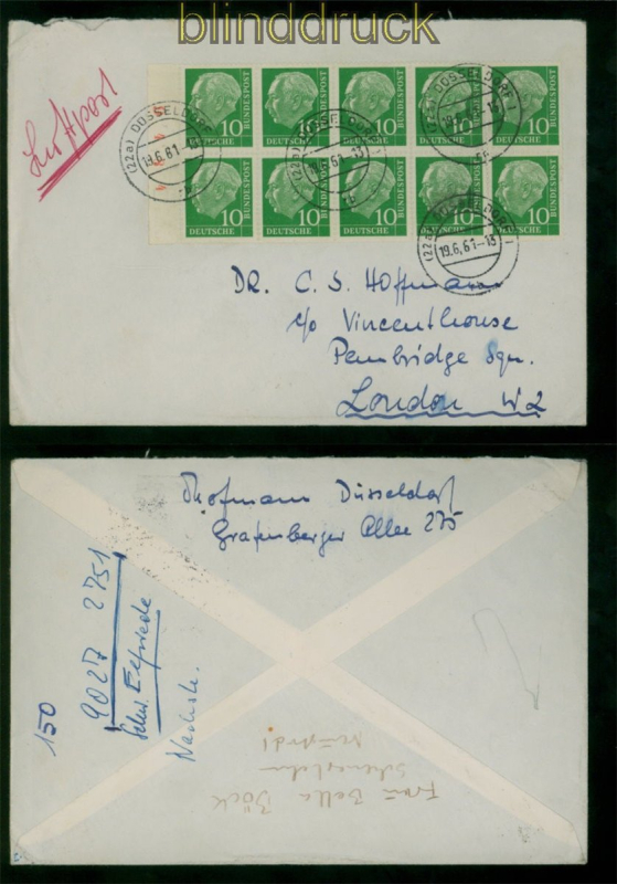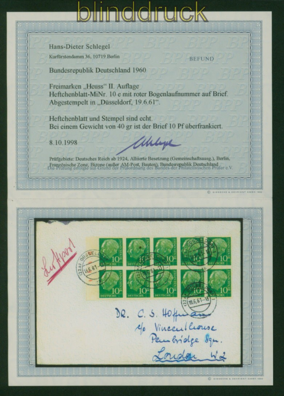 Bundesrepublik Zusammendrucke Heftchenblatt # 10 e rote Bogenlaufnummer auf Brief Fotobefund Schlegel BPP Heftchenblatt 10 Pfg. Heuss in der II. Auflage mit Heftchenblattrand und roter Bogenlaufnummer auf Auslandsbrief aus Düsseldorf 16.6.1961 nach London Fotobefund Schlegel BPP: Heftchenblatt und Stempel sind echt, Brief um 10 Pfennig überfrankert