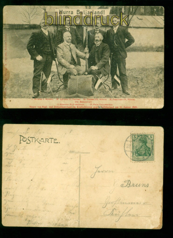 Niedersachsen Butjardingen sw-AK Klootschiessen gegen Ostfriesland 1908 Hurra Butjarland Sieger von Stadt- und Butjadingerland im Klootschiessen gegen Ostfriesland am 14. Januar 1908 mit Namen der einzelnen Personen Karte mit zwei Papierbrüchen seltene Karte mit Spuren Karte gelaufen Erhaltung siehe Scan