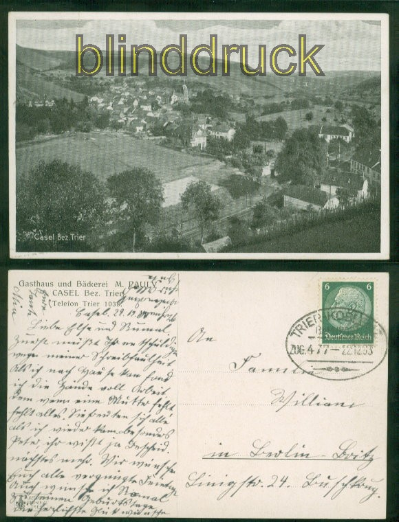 Rheinland-Pfalz Casel (Bz. Trier) sw-AK Gasthaus und Bäckerei M. Pauly Bahnpost 1933 Karte gelaufen mit Bahnpost Trier - Koblenz Zug 477 22.12.1933 nach Berlin - Britz oben links ca. 1 cm Einriß Erhaltung siehe Scan