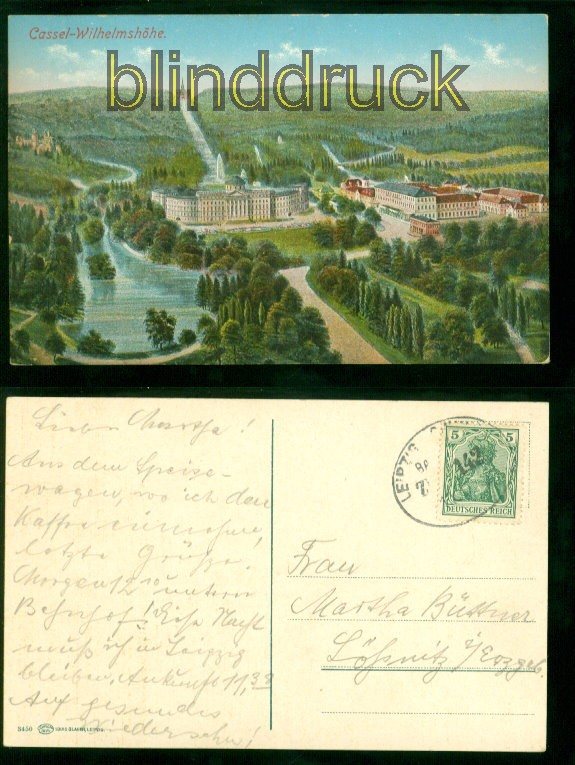 Hessen Cassel-Wilhelmshöhe farb-AK Bahnpost 1912 nach Lösnitz Karte gelaufen mit Bahnpost Leipzig - ????? Zug 142 1912 nach Lösnitz Erhaltung siehe Scan