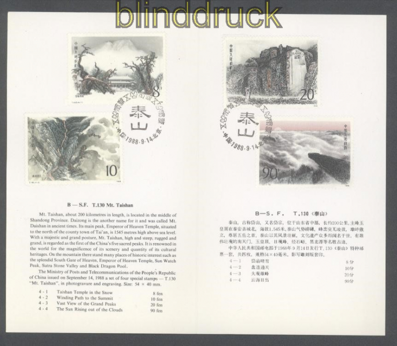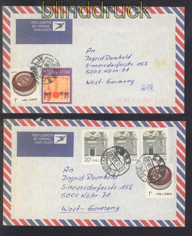 Volksrepublik China zwei Gedenkblätter als FDC mit SSt. sowie zwei Briefe 1988 Mi # 2190/93, Mi # 2194/97 auf Gedenkblätter mit SSt. vom Ersttag sowie zwei Auslands-Luftpost-Briefe in Mischfrankatur MiF gute Erhaltung siehe Scan