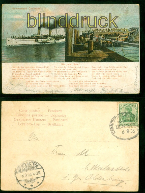 Niedersachsen Cuxhaven Nordseebad farb-AK Hafen mit Lied "alte Liebe" 1903 nach Westerstede Karte gelaufen mit Bagnpost Hannover - Geestemünde 8.9.1903 nach Westerstede Erhaltung siehe Scan