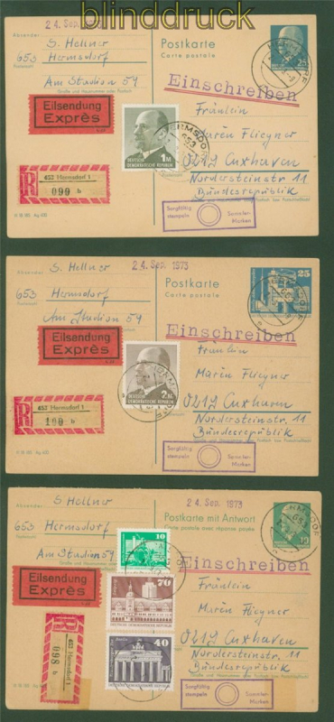 Deutsche Demokratische Republik drei GSK # P 76, P 77 und P 80 MiF Einschreiben-Eilboten nach Cuxhaven drei verschiedene Ganzsachenkarten mit Zusatzfrankatur alle Karten gelaufen als Eilboten-Einschreiben aus Hermsdorf nach Cuxhaven rückseitig mit Ankunftsstempel Erhaltung siehe Scan