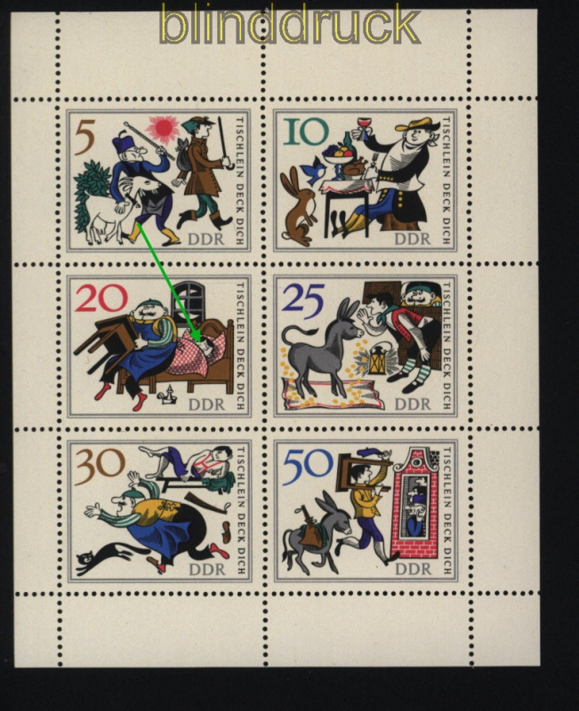 Deutsche Demokratische Republik Mi # 1236/41 mit 1238 I postfrisch im Kleinbogen Märchen (I) Kleinbogen Märchen (I) Mi # 1238 mit Plattenfehler I: Strich auf der Wange des Jungen postfrisch Erhaltung siehe Scan