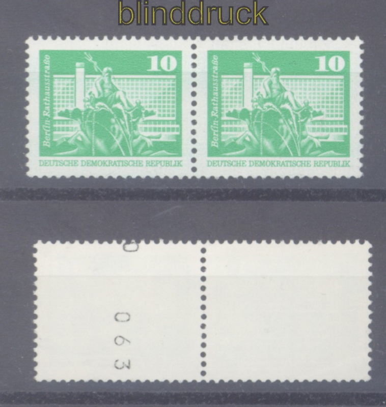 Deutsche Demokratische Republik Mi # 1868 R (2) postfrisch mit verschobener rückseitiger Nummer Rollenmarke 10 Pfg. Aufbau in der DDR Kleinformat Rollenmarke im senkrechten Paar mit rückseitiger Nummer Nummer nach rechts verschoben, sodass der Teil einer anderen Nummer links wieder erscheint Erhaltung siehe Scan