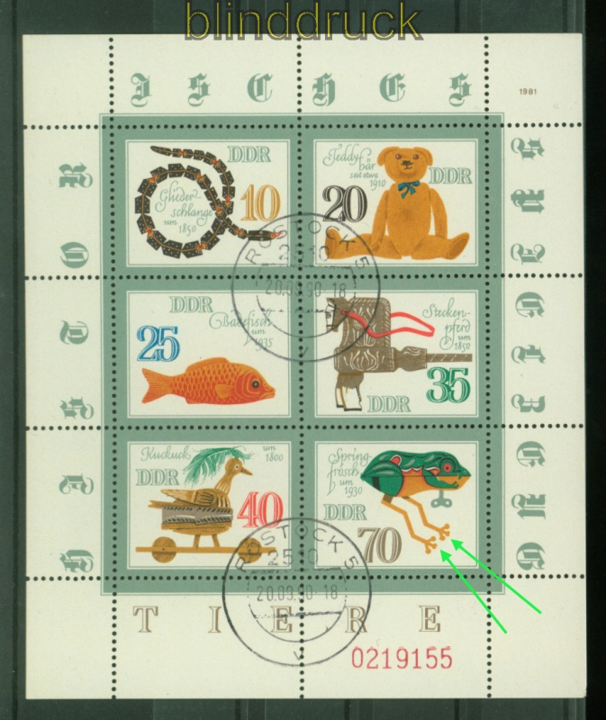 Deutsche Demokratische Republik Mi # 2666 I gestempelt im Kleinbogen Plattenfehler 70 Pfg. Historisches Spielzeug mit Plattenfehler I: beide Mittelzehen eingekerbt gestempelt im Kleinbogen einwandfreie Erhaltung siehe Scan