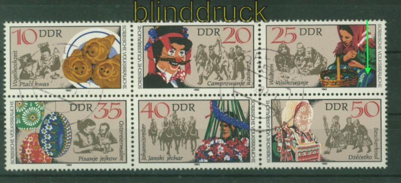 Deutsche Demokratische Republik Mi # 2716/21 mit 2718 I gestempelt 6er-Block mit Tagesstempel Sorbische Volksbräuche kompletter 6er-Block mit Plattenfehler I auf Mi # 2718: fehlende weiße Perlin rechts vom Korb entwertet mit Tagesstempel Erhaltung siehe Scan
