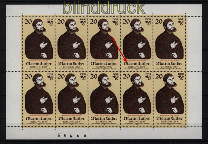 Deutsche Demokratische Republik Mi # 2755 postfrisch Kleinbogen III Martin Luther 20 Pfg. Martin Luther mit Plattenfehler III: Loch im rechten Abstrich des M von Martin im Kleinbogen mit Bogenzähler postfrisch Erhaltung siehe Scan