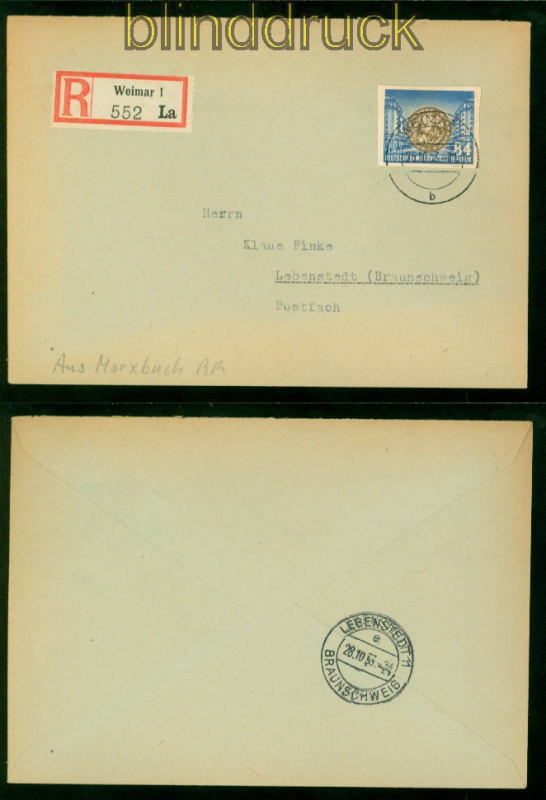 Deutsche Demokratische Republik Mi # 353 U EF aus Gedenkheft R-Brief Weimar 25.10.1953 nach Lebenstedt 84 Pfennig Karl-Karx-Allee ungezähnt die Marke stammt aus dem Gedenkheft und hatte keine Frankaturkraft dennoch sind einige Briefe mit solchen Marken durchgeschlüft Einzelfrankatur auf Einschreiben aus Weimar 25.10.1953 nach Lebenstedt Ankunftsstempel wird selten angeboten Erhaltung siehe Scan