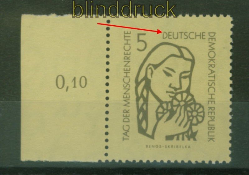 Deutsche Demokratische Republik Mi # 548 V postfrisch 5 Pfg. Tag der Menschenrechte Plattenfehler 5 Pfg. Tag der Menschenrechte mit Plattenfehler V: D von Deutsche oben links gebrochen postfrisch Erhaltung siehe Scan