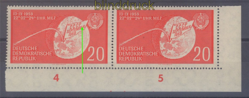 Deutsche Demokratische Republik Mi # 721 I postfrisch Plattenfehler Weltraumrakete Lunik 2 20 Pfennig Landung der sowjetischen Weltraumrakete Lunik 2 auf dem Mond im waagerechten Paar mit Plattenfehler I: oberer Querstrich des dritten e von September kurz postfrisch Erhaltung siehe Scan