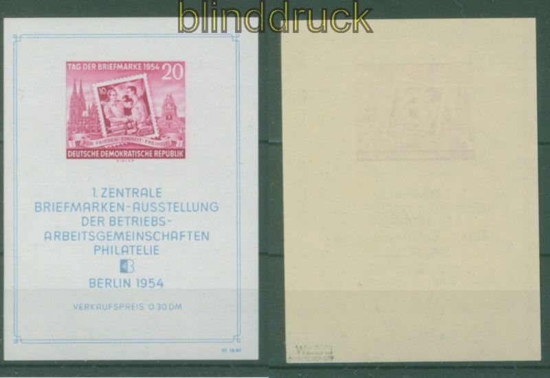 Deutsche Demokratische Republik Mi # Block 10 XII postfrisch Tag der Briefmarke geprüft Dr. Ruscher BPP Blockausgabe: Tag der Briefmarke 1954 Blockausgabe Erste Zentrale Briefmarkenausstellung der Betriebsarbeitsgemeinschaften Philatelie, Berlin postfrisch geprüft Dr. Ruscher BPP Erhaltung siehe Scan