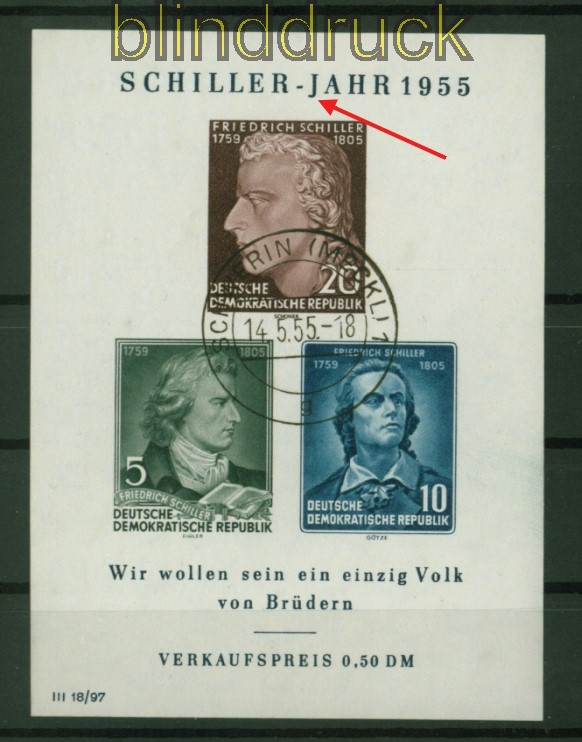 Deutsche Demokratische Republik DDR Mi # Block 12 IV gestempelt Schillerjahr Plattenfehler Tagesstempel mit Plattenfehler Blockausgabe: Schillerjahr 1955 mit Plattenfehler IV: J von Jahr verlängert entwertet mit Tagesstempel Erhaltung siehe Scan