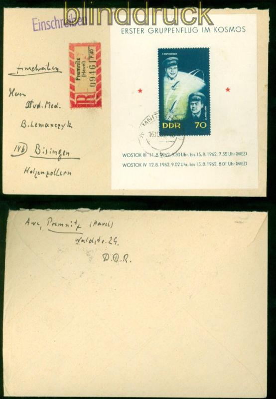Deutsche Demokratische Republik Mi # Block 17 EF auf Einschreiben Premnitz 16.10.1962 nach Bissingen Blockausgabe: Erster Gruppenflug der Raumschiffe Wostok 3 und Wostok 4 auf Einschreiben aus Premnitz 16.10.1962 nach Bissingen Erhaltung siehe Scan