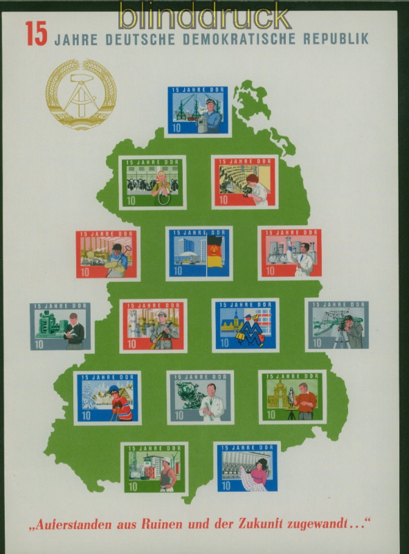 Deutsche Demokratische Republik DDR Mi # Block 19 wie verausgabt ohne Gummi 15 Jahre DDR Großblock Blockausgabe: 15 Jahre DDR ungestempelt wie verausgabt ohne Gummi Ränder gut erhalten Großblock der DDR Versand nur im Maxi-Brief möglich Erhaltung siehe Scan