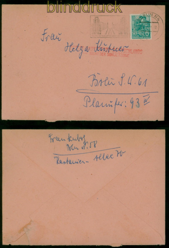 Deutsche Demokratische Republik Postkrieg Burhop # 61.2-2.3. Fc roter Zweizeiler Berlin N4 nach Berlin SW 61 beanstandeter Maschinenstempel: Berlin Hauptstadt der DDR abgeschlagener Gegenstempel L2 in rot: Berlin Hauptstadt Deutschlands / nicht der Sowjetzone gelaufen aus Berlin N4 nach Berlin SW 6 Erhaltung siehe Scan