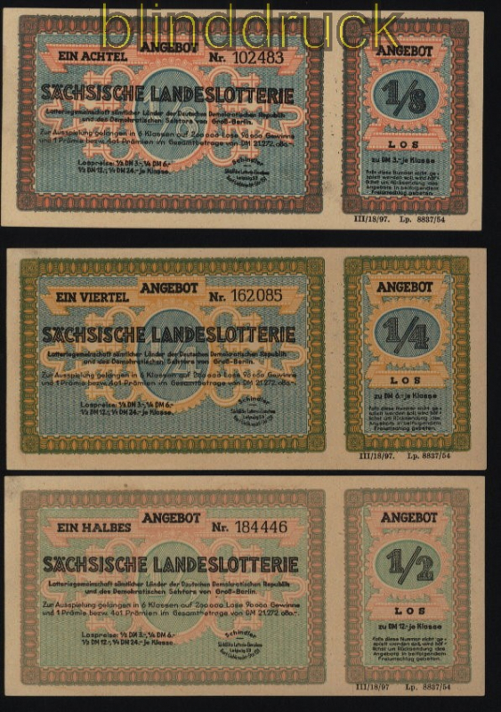 Deutsche Demokratische Republik Sächsiche Landeslotterie 3 Lose Schindler Lotterieeinnahme drei Lose: 1/8 Losr, 1/4 Los und ein 1/2 Los Schindler Sächsische Lotterieeinnahme Leipzig 53 Karl-Liebknecht-Str. 152 drei Angebotslose alle drei Lose mit Druckvermerk: III/18/97 Lp. 8837/54 nicht gefaltet Erhaltung siehe Scan