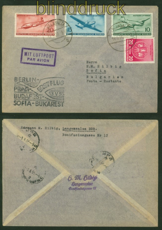 Deutsche Demokratische Republik drei Luftpost-Erstflugbelege 1956 frankiert mit Luftpostmarken zwei Erstflubelege nach Waschau (Rückklappen fehlen ein Erstflugbeleg nach Bukarest mit allen Stempeln Erhaltung siehe Scan