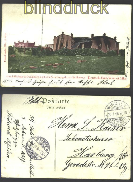 Deutsch-Südwestafrika DSWA sw-AK Feldpostkarte Hereoaufstand 1906 Geschäftshaus in Okanhandja nach der Zerstörung durch die Herero Karte gelaufen als Feldpostkarte während des Hereroaufstandes aus Windhuk 22.1.1906 nach Harburg Erhaltung siehe Scan