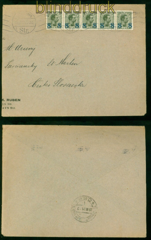 Dänemark Mi # 113 (5) MeF waagerechter 5er-Streifen Auslandsbrief 14.11.1921 Aufdruckmarke 8 Öre auf 12 Öre in blau als waagerechter 5er-Streifen zweite Marke von links mit Plattenfehler Delle rechts am Oval (AFA # 119Iz) als Mehrfachfrankatur auf Auslandsbrief aus Kopenhagen 14.11.1921 in die Tschecheslowakei Firmenvordruckbrief rechts beschnitten Ankunftsstempel Erhaltung siehe Scan