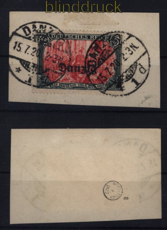 Danzig Mi # 15 B gestempelt auf Briefstück geprüft Infla Berlin 5 Mark Aufdruckmarke 25:17 Zähnungslöcher gestempelt auf Briefstück geprüft Infla Berlin Erhaltung siehe Scan