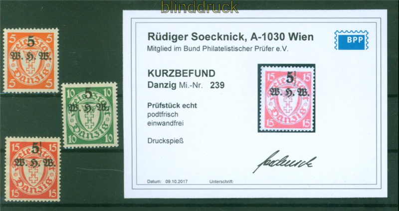 Danzig Mi # 237/39 postfrisch WHW Winterhilfswerk 1934 KB Soecknick BPP Aufdruckmarken Winterhilfswerk 1934 komplette Ausgabe postfrisch Kurzbefund KB Soecknick BPP für Mi # 239: echt, posfrisch, einwandfrei, Druckspieß Erhaltung siehe Scan
