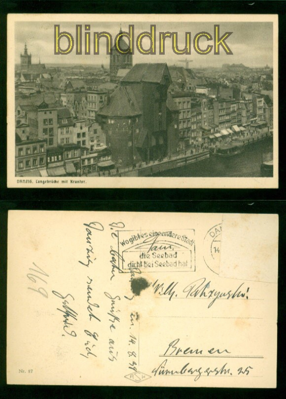 Danzig sw-AK Krantor mit Lange Brücke 1939 nach Bremen (d9754)