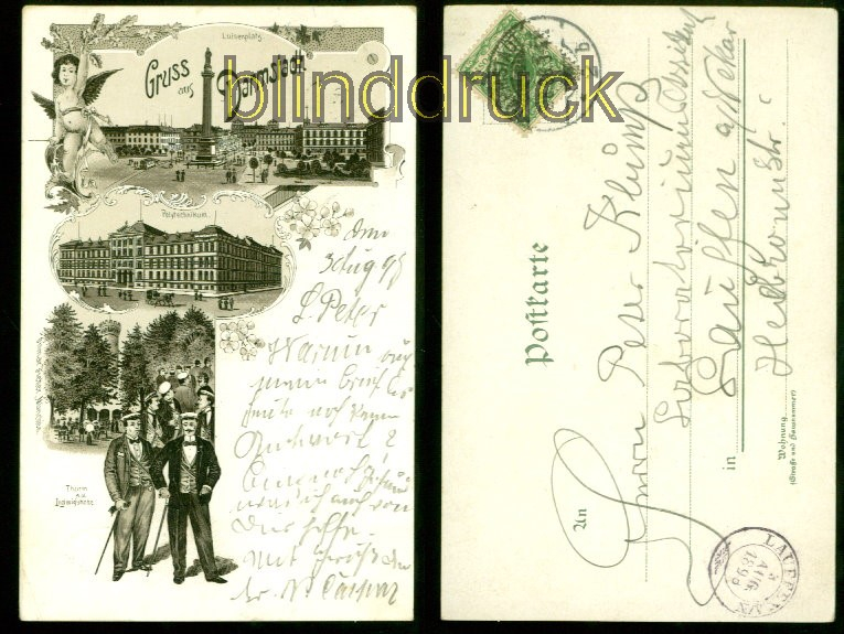 Hessen Gruss aus Darmstadt Litho-AK drei Ansichten 1898 nach Lauffen drei Ansichten: Luisenplatz, Polytechnikum und Thurm auf der Ludwigshöhe Karte gelaufen aus Darmstadt 3.8.1898 nach Lauffen Ankunftsstempel Erhaltung siehe Scan