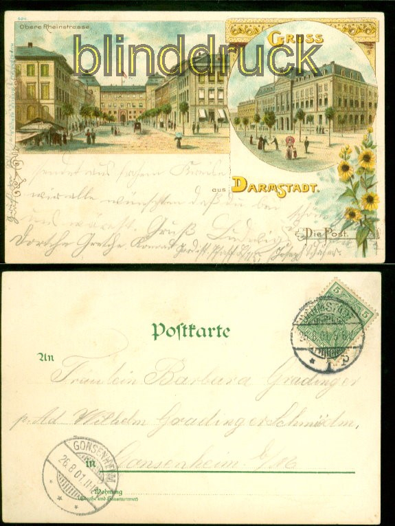 Hessen Gruss aus Darmstadt Litho-AK zwei Ansichten 1901 nach Gonsenheim zwei Ansichten: obere Rheinstrasse und Post Karte gelaufen aus Darmstadt 25.08.1901 nach Gonsenheim Ankunftsstempel Erhaltung siehe Scan