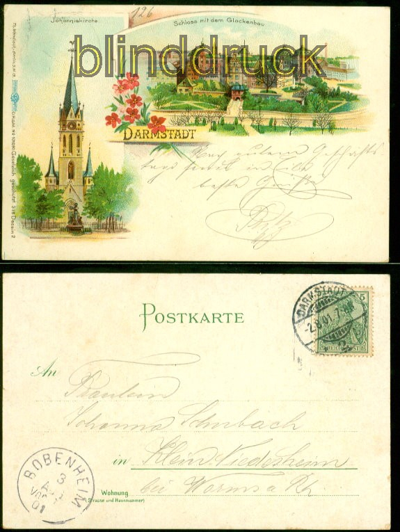 Hessen Darmstadt Litho-AK zwei Ansichten 1901 nach Klein-Niedesheim zwei Ansichten: Johanniskirche und Schloss mit dem Glockenbau Karte gelaufen aus Darmstadt 2.8.1901 nach Klein-Niedesheim Ankunftsstempel Erhaltung siehe Scan