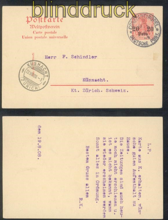 Deutsche Post in der Türkei GSK P 13 gestempelt Constantinopel Bedarf 20 Para Aufdruck-Ganzsachenkarte Karte gelaufen aus Constantinopel 19.8.1908 nach Küsnacht in die Schweiz Erhaltung siehe Scan