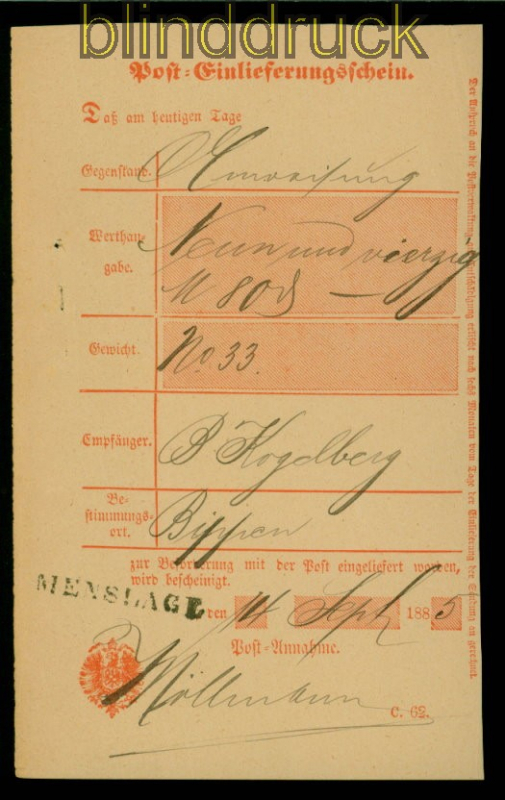 Deutsches Reich Menslage Aufgabe-Schein 1885 nach Bippen Formular C. 62. mit Wertangabe aus Menslage 14.9.1885 nach Bippen Erhaltung siehe Scan