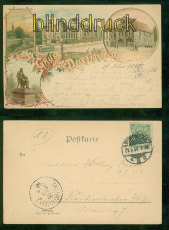 Nordrhein-Westfalen Gruss aus Dortmund Litho-AK vier Ansichten 1898 nach Kaiserslautern vier Ansichten: Fredenaum, Vehmlinde, Kaiser-Wilhelm-Denkmal und Altes Rathaus Karte gelaufen aus Dortmund 21.6.1898 nach Kaiserslautern Erhaltung siehe Scan