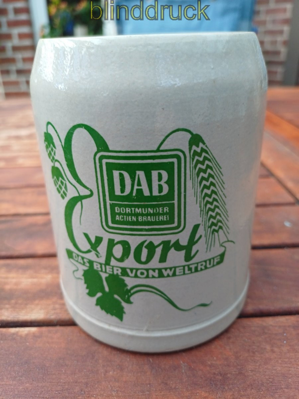 Dortmunder Actien Brauerei DAB alter Bierkrug aus Keramik 0,5 Liter Sammelkrug Export das Bier von Weltruf seltener Krug der Dortmunder Aktien Brauerei mit helllgrünem Aufdruck Steinkrug unbeschädigt und offensichtlich nie benutzt Erhaltung siehe Foto