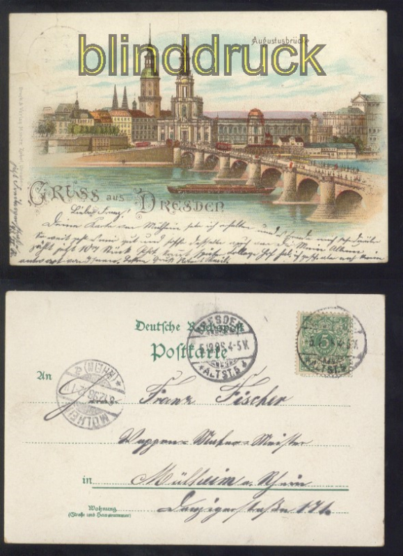 Sachsen Gruss aus Dresden farb-Litho-AK Augustusbrücke 1898 Karte gelaufen aus Dresden 5.12.1898 nach Mülheim am Rhein Erhaltung siehe Scan