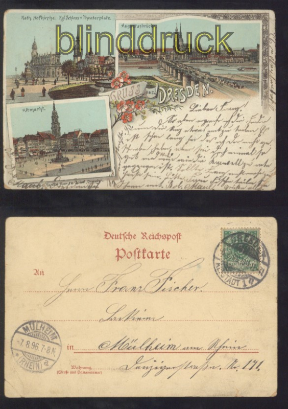 Sachsen Gruss aus Dresden farb-Litho-AK drei Ansichten 1898 drei Ansichten: Kath. Hofkirche, ,Kgl. Schloos v. Theaterplatz, Augustusbrücke und Altmarkt Karte gelaufen aus Dresden 6.8.1896 nach Mülheim am Rhein Erhaltung siehe Scan