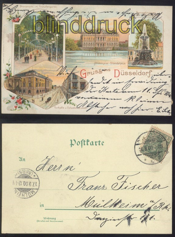 Nordrhein-Westfalen Gruss aus Düsseldorf sw-AK vier Ansichten 1900 vier Ansichten: Promenade im Tonhallengarten, Provinzial-Ständehaus, Springbrunnen auf dem Corneliusplatz und Tonhalle und Schadowstrasse Karte gelaufen aus Düsseldorf 16.9.1900 nach Mülheim am Rhein Erhaltung siehe Scan
