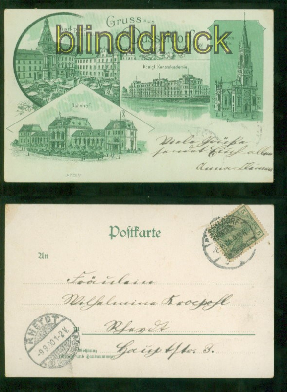 Nordrhein-Westfalen Gruss aus Düsseldorf farb-Litho-AK vier Ansichten 1900 nach Rheydt vier Ansichten: Schloss Johanniskirche, Marktplatz mit Rathaus, Bahnhof und königliche Kunstakademie Karte gelaufen aus Düseldorf 8.9.1900 nach Rheydt Ankunftsstempel Erhaltung siehe Scan