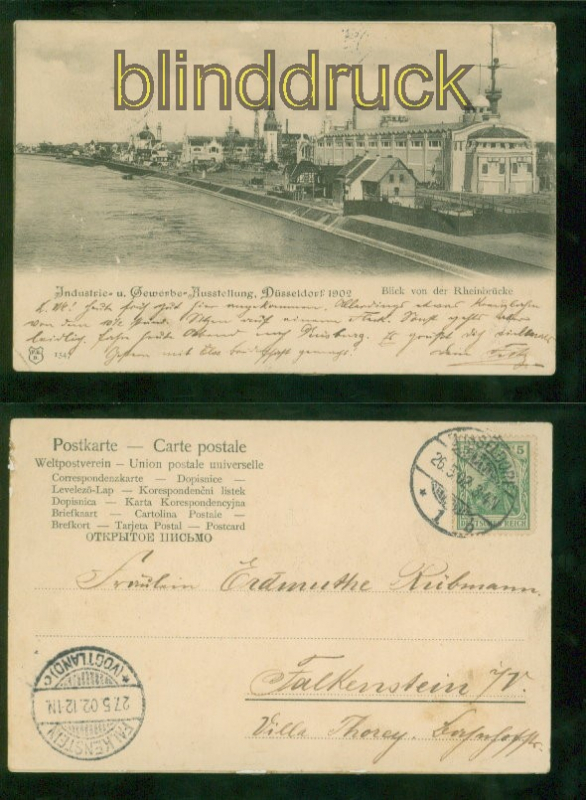 Nordrhein-Westfalen Düsseldorf sw-AK Industrie und Gewerbeausstellung 1902 Blick von der Rheinbrücke offizlielle Ausstellungskarte Karte gelaufen aus Düsseldorf 26.5.1902 nach Falkenstein Erhaltung siehe Scan