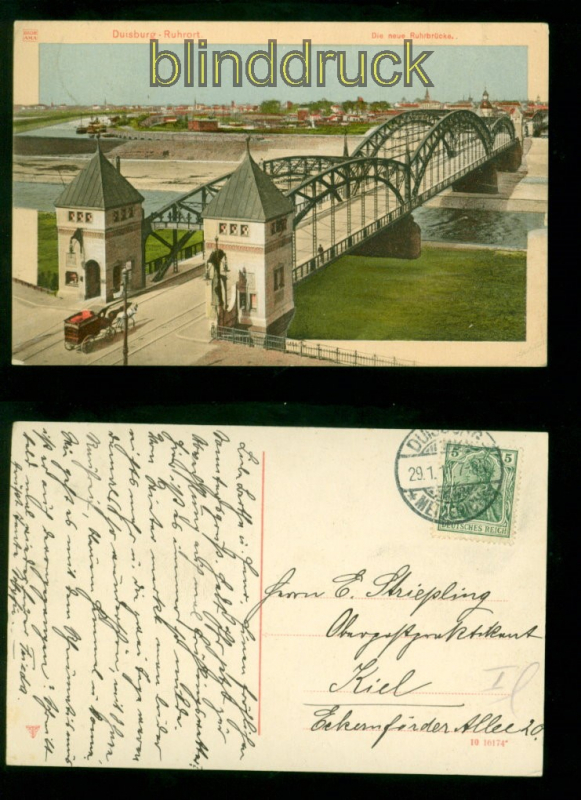 Nordrhein-Westfalen Duisburg-Ruhrort farb-AK Die neue Rheinbrücke 1911 nach Kiel Karte gelaufen aus Duisburg 29.1.1911 nach Kiel Erhaltung siehe Scan