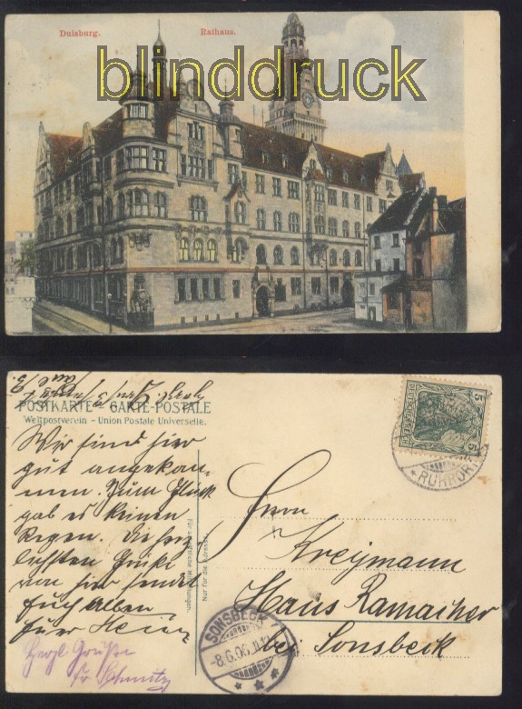 Nordrhein-Westfalen Duisburg farb-AK Rathaus 1906 Karte gelaufen aus Duisburg 7.6.1906 nach Sonsbeck Erhaltung siehe Scan