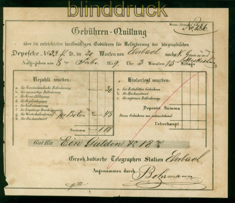 Eberbach Quittung über eine telegraphische Depesche 8.2.1859 nach Gmünd-Meckesheim Erhaltung siehe Scan
