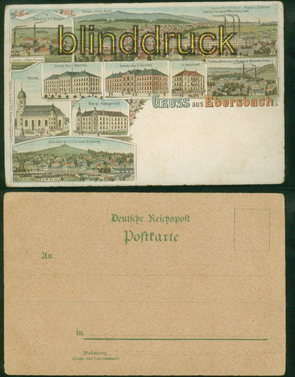 Sachsen Ebersbach farb-AK Gruss aus .... neun Ansichten ungebraucht neun Ansichten: Fabrik von C.F. Belger, vier Fabriken, Schule des I. Bezirks, Schule des II. Bezirks, Gemeindeamt, Färberei und Bleicherei, Kirche, Königl. Amtsgericht, Bahnhof mit Haine und Hainberg Karte nicht gelaufen Erhaltung siehe Scan