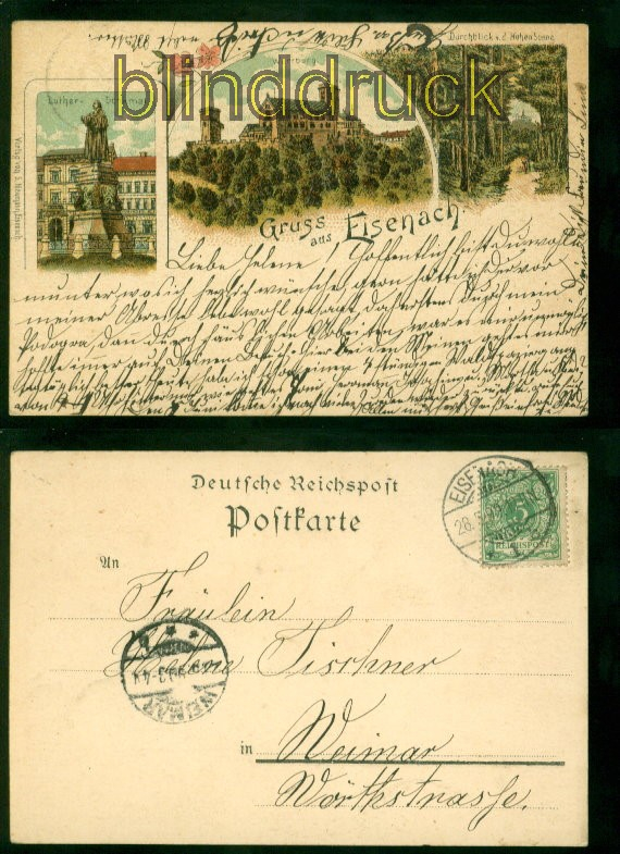 Thüringen Gruss aus Eisenach Litho-AK drei Ansichten 1899 nach Weimar drei Ansichten: Luther-Ddenkmal, Wartburg und Durchblick von der hohen Sonne Karte gelaufen aus Eisenach 28.3.1899 nach Weimar Erhaltung siehe Scan