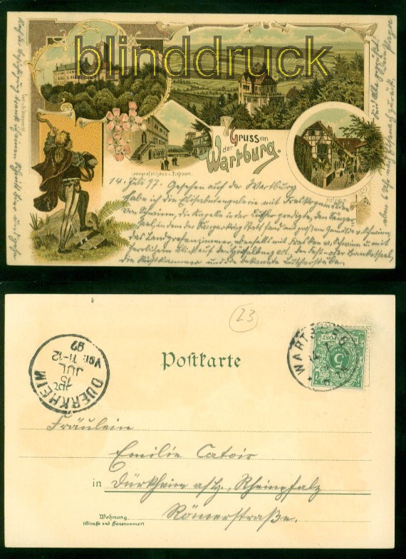 Thüringen Eisenach Litho-AK Gruss aus von der Wartburg fünf Ansichten 1897 nach Dürkheim drei Ansichten Karte gelaufen aus Wartburg 14.7.1897 nach Dürkheim Erhaltung siehe Scan