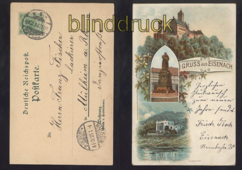 Sachsen-Anhalt Gruss aus Eisenach farb-AK drei Ansichten 1898Karte gelaufen aus Eisenach 30.12.1897 nach Mülheim am Rhein Erhaltung siehe Scan