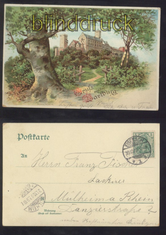 Sachsen-Anhalt Eisenach farb-AK Gruss von der Wartburg 1901 Karte gelaufen aus Eisenach 30.10.1902 nach Mülheim am Rhein Erhaltung siehe Scan