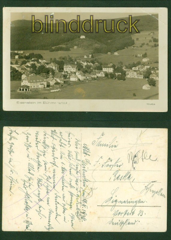 Böhmen Eisenstein im Böhmerwald sw-AK Gesamtansicht "Wurbs"-Foto 1936 nach Sigmaringen Postkarte nach einer Fotografie des bekannten Fotografen Gottfried Josef Wurbs (1894-1970) Karte nicht frankiert aber datiert auf den 14.4.1936 und adressiert nach Sigmaringen Eckbug oben rechts und oben links kleine Schürfung Erhaltung siehe Scan